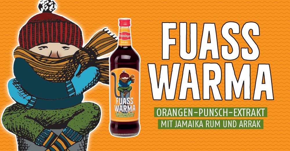 Seit 2015 zeigt sich der Fuasswarma Orangenpunsch im neuen und modernen Design, das beliebte Fuasswarma-Männchen ist dem Etikett aber erhalten geblieben. Zusammen mit dem Penninger Jagertee ist der Fuasswarma unser beliebtes Heißgetränk für den Winter. Probiert doch am besten gleich mal, Ihr werdet begeistert sein!